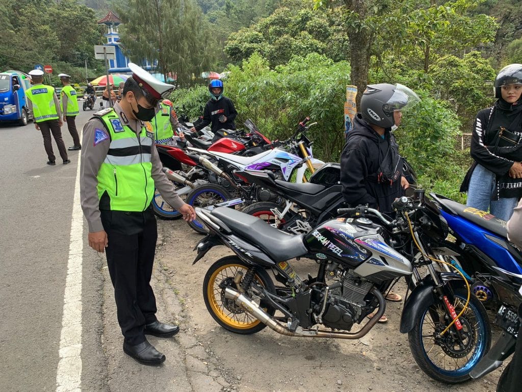 KARANGANYAR (iPOLICENews) – Satlantas Polres Karanganyar kembali melakukan penindakan pelanggaran knalpot brong yang melintas di Cemoro Kandang, Tawangmangu. Minggu (17/7) pagi.