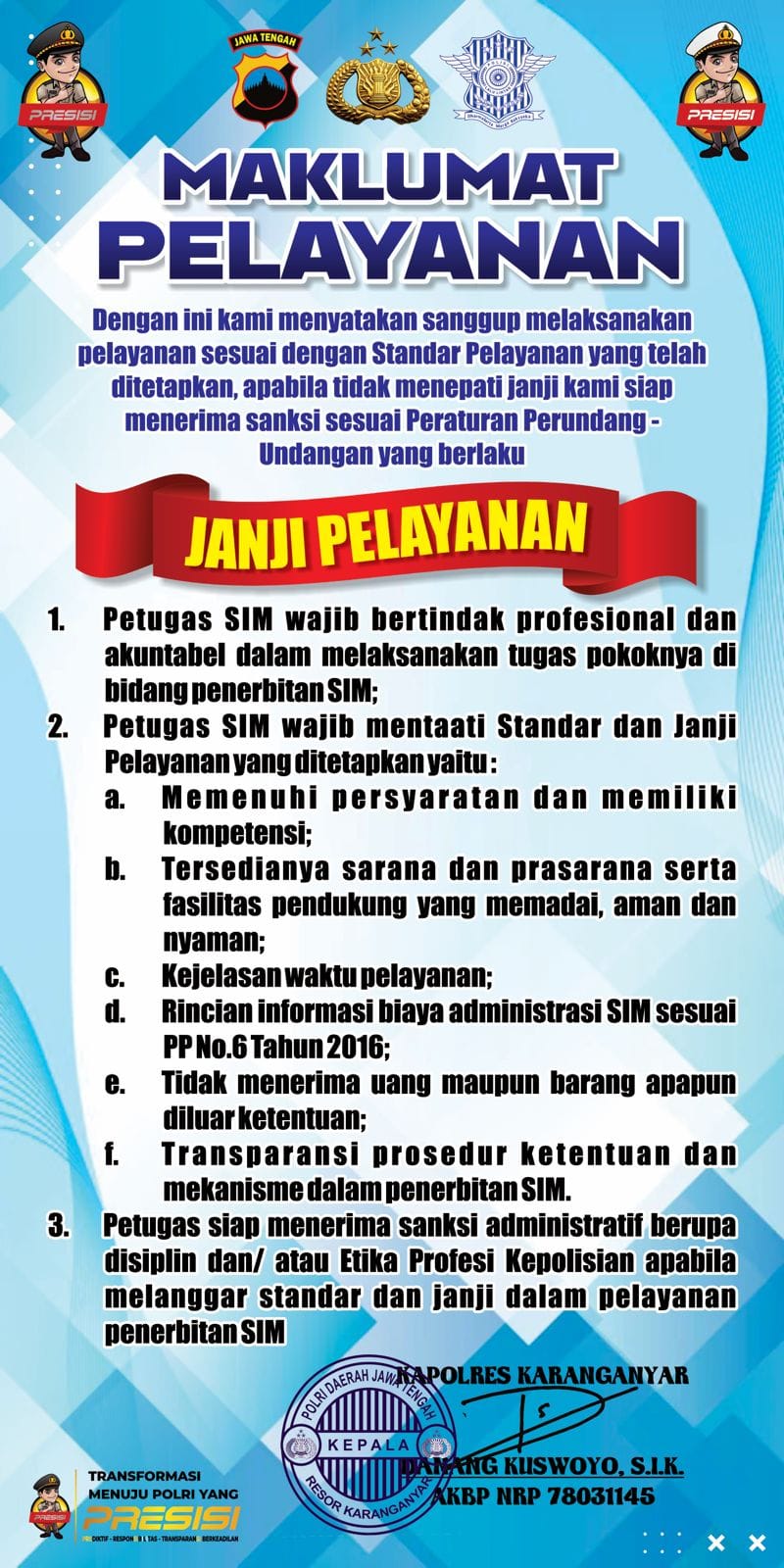 KARANGANYAR (iPOLICENews) – Dalam rangka mewujudkan Pelayanan Publik yang Prima, Satlantas Polres Karanganyar mempunyai maklumat pelayanan yang berisikan janji pelayanan terkait kesanggupan untuk melaksanakan pelayanan susuai dengan Standar Pelayanan yang telah ditetapkan, dan apabila tidak menepati siap menerima sanksi sesuai Peraturan Perundang – undangan yang berlaku.
