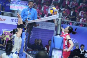 MAGETAN (iPOLICENews) — Tim voli Indomaret Sidoarjo menutup kesempatan Perumda Tirta Bhagasasi ke Grand Final setelah memenangkan laga yang digelar di GOR Ki Mageti, Magetan, hari Kamis (16/10) siang dengan skor 3-1 (25-20, 25-23, 23-25, 33-31).