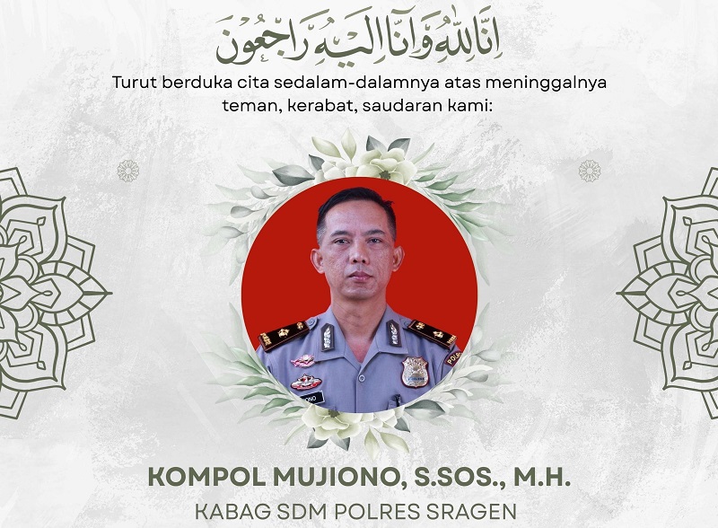 SRAGEN (iPOLICENews) – Suasana haru menyelimuti keluarga besar Polres Sragen setelah kabar berpulangnya Kompol Mujiono, S.Sos., M.H., pada Kamis (23/10/2025) petang. Perwira menengah yang dikenal ramah dan berdedikasi ini menjabat sebagai Kabag SDM Polres Sragen sebelum menghembuskan napas terakhirnya di RS Sarila Husada Sragen.