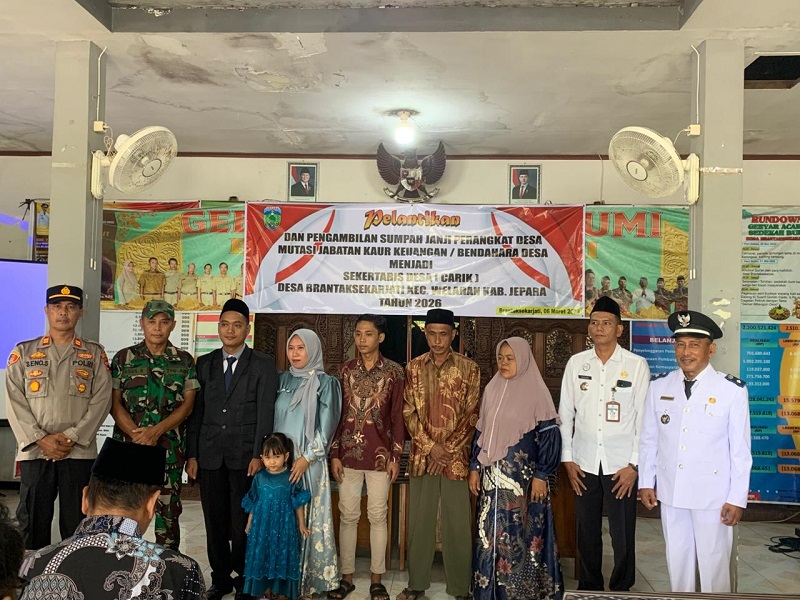 JEPARA (iPOLICENews) – Pemerintah Desa Brantaksekarjati, Kecamatan Welahan, Kabupaten Jepara, menggelar acara Pelantikan dan Pengambilan Sumpah Janji Perangkat Desa untuk jabatan Sekretaris Desa (Carik) Tahun 2026, Jumat (06/03/2026). Kegiatan tersebut dilaksanakan di Balai Desa Brantaksekarjati.